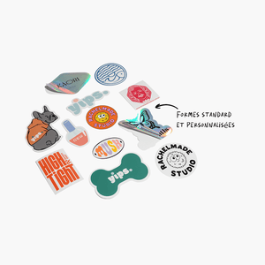 Le seuil de commande est fixé à un sticker individuel, ce qui vous permet de tester une approche marketing innovante ou simplement de faire imprimer différents graphismes sans vous soucier des stocks. Les formes et formats personnalisés vous permettent de mettre en valeur vos graphismes. Choisissez un format allant de 2,5 x 2,5 cm à 15 x 20 cm.Premiers pas
