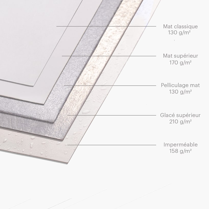 Le choix du papier pour l’impression d’une carte de visite dépend du type de graphisme. Le papier glacé est tout particulièrement adapté aux graphismes incluant une photographie ou des couleurs vives : la façon dont la lumière éclaire le papier fait ressortir les couleurs et les images de la carte. Si votre graphisme comprend peu d’encre ou est à dominante blanche, envisagez un autre papier. En effet, la brillance risque d’être gênante.