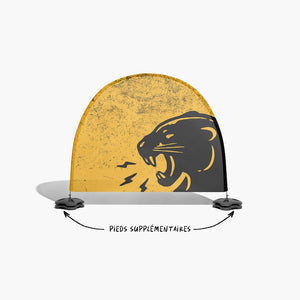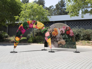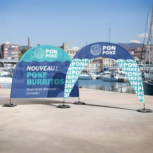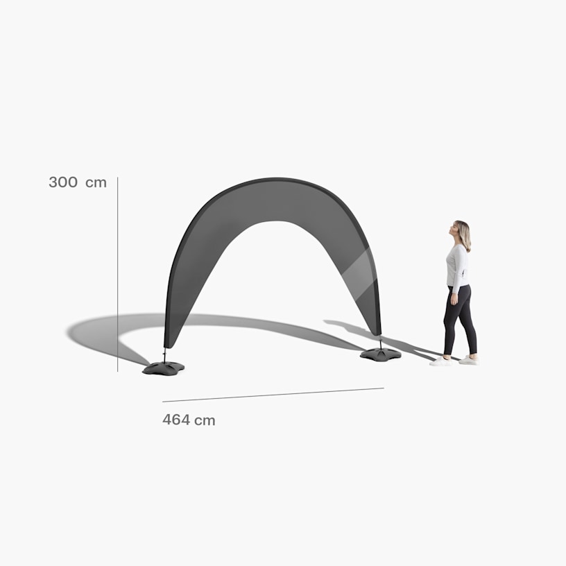 Vous avez besoin d'une signalisation extérieure bien au-dessus des piétons ? Découvrez les arches publicitaires. Elles sont idéales pour attirer l'œil lors d'événements ou pour marquer le départ de courses, et il est impossible de ne pas les remarquer : leur grande structure facile à monter présente un format de 4 mx 3 m. Les arches publicitaires sont aussi très belles : elles constituent un superbe décor pour faire les photos des organisateurs et des participants !__Démarquez-vous partout __ Que vous choisissiez une arche demi-lune pour encadrer une entrée ou une arche complète pour un affichage sur pied, vous avez là la solution toute trouvée pour impressionner les passants. Leur format, l'impression en couleur et la bordure en noir ou blanc permettent à votre graphisme de sortir du lot, quel que soit l'emplacement de votre arche. Chaque arche est livrée avec un sac de transport. Si vous envisagez d'utiliser la vôtre dans des conditions venteuses, vous pouvez ajouter des pieds de lestage empilables.