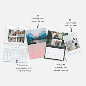 Grâce à notre vaste sélection de modèles et de mises en page, vous pouvez créer un calendrier photo adapté non seulement à votre style et à votre intérieur, mais aussi à votre emploi du temps. Disponibles dans 4 nouveaux formats (A4 compact, A3 classique, Double A4 et Double A3), et avec 2 options de papier au choix, ces calendriers s'adapteront à votre espace et à vos envies. Tous nos calendriers photo sont imprimés sur un papier issu de sources responsables.Un processus de création intuitif