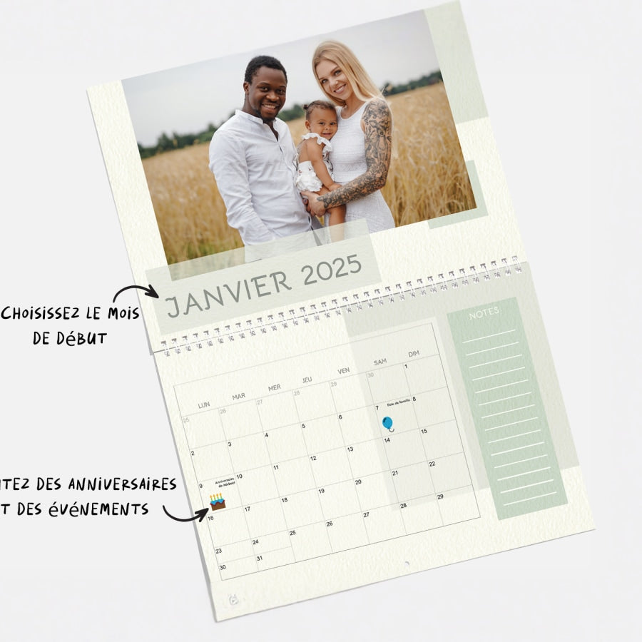 Rassemblez vos plus beaux moments et photos dans un calendrier mural 2025. À la recherche d'une idée cadeau à la fois pratique et esthétique ? Les calendriers muraux feront plaisir à vos proches en toute occasion : la Saint Valentin, la fête des Mères, la fête des Pères, les mariages, la rentrée des classes, Noël, les fêtes de fin d'année et bien plus encore ! Les calendriers photo personnalisés sont aussi parfaits pour vous organiser et planifier vos journées. Rendez-vous chez le médecin, partiels, réunions de famille, anniversaire de mamie ; vous n'aurez plus aucune excuse pour oublier les événements importants de votre vie. Créez-en un pour vous ou commandez plusieurs exemplaires : ces cadeaux populaires sont appréciés par toute la famille.Une personnalisation sur mesure