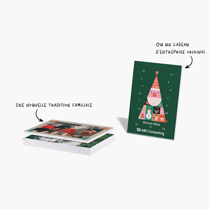 Que vous souhaitiez stimuler l'engagement de vos clients ou que vous cherchiez une délicieuse surprise à offrir à vos proches, les calendriers de l'Avent personnalisés avec chocolats sont un excellent cadeau à l'approche de la fin d'année. Commencez la saison des fêtes dans la joie avec des calendriers de l'Avent photo créatifs, contenant de délicieuses surprises.Personnalisez votre calendrier de l'Avent 2025 avec des photos