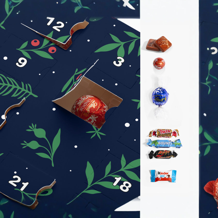 Nos calendriers de l'Avent photo sont dotés d'un avant personnalisable, conçus en carton certifié FSC®. Chaque calendrier compte 24 fenêtres perforées, derrière lesquelles vous trouverez de délicieux chocolats. Les gourmands ont le choix entre 5 options : Bouchées LINDOR Lindt®, Mini bouchées LINDOR Lindt, CELEBRATIONS™ ou Mini chocolats Kinder®, sans oublier nos chocolats au lait non fourrés en marque blanche. Nous proposons également un modèle de calendrier de l'Avent végan.Personnalisation facile