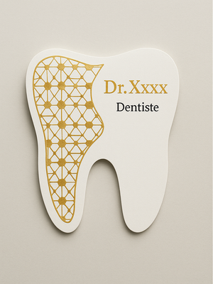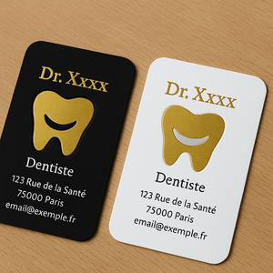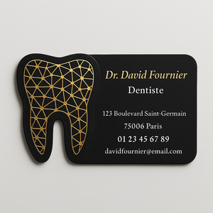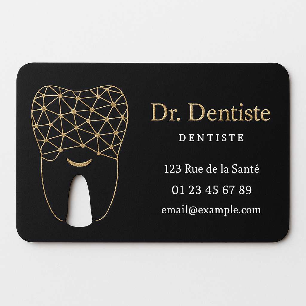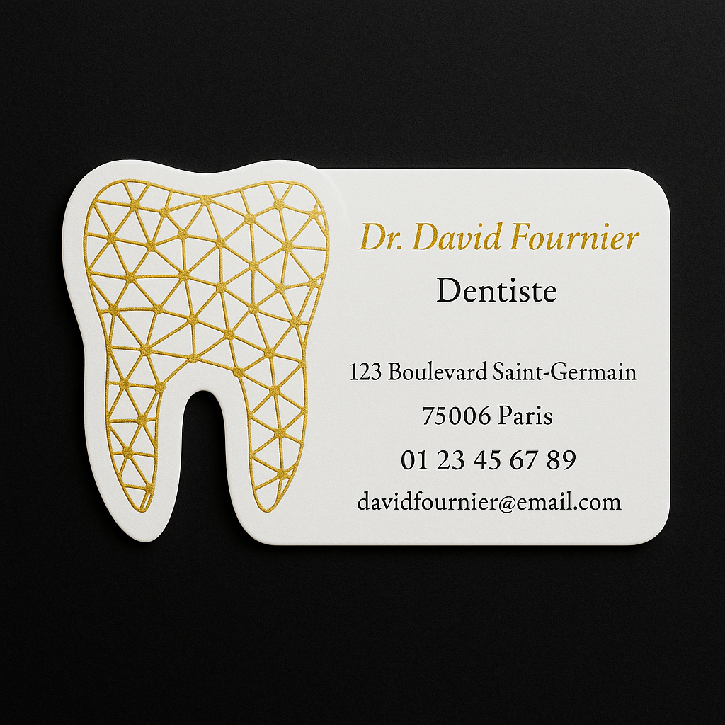 Carte de visite premium pour chirurgien-dentiste, avec découpe en forme de dent et finitions haut de gamme : dorure or/argent , possibilité d' impression blanche sur papier noir et vernis sélectif 3D sur le motif. Un design mémorable, difficile à copier, idéal pour une image professionnelle et élégante.