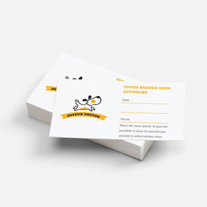 Nous savons à quel point il est important de créer des relations solides avec vos clients. Et parfois, ce sont les petits détails qui font la différence. Nos cartes de rendez-vous personnalisées sont une solution pratique qui permettra à vos clients et vos patients de ne plus jamais oublier un rendez-vous, tout en mettant en valeur les informations de votre entreprise. Que ce soit pour un cabinet médical ou vétérinaire, un institut de beauté, un spa, une concession automobile ou des services à domicile, offrez à vos clients ou à vos patients une solution pratique qui les aidera à rester bien organisés.La commodité à portée de main