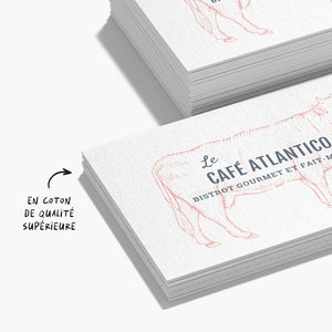 Que dites-vous de laisser une impression durable sur les clients ? Les cartes de visite en coton sont de très bonnes alternatives aux papiers traditionnels. Elles sont tissées à partir de linters de coton pré-consommation, des fibres qui sont trop courtes pour être transformées en tissu. Vous bénéficiez d'une carte unique aux origines uniques.