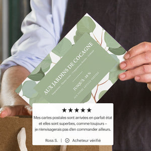 Prêt à imprimer votre carte postale ? Embarquez par parcourir nos nombreux modèles entièrement personnalisables, déclinés pour différents secteurs d'activité et événements. Grâce à nos nombreux disponibles, vous pourrez choisir les dimensions qui conviennent le mieux à vos besoins. Si vous disposez déjà d'un graphisme, utilisez notre fonctionnalité d'importation. Une fois que vous avez trouvé un graphisme qui vous plaît, ajoutez-y toutes vos informations essentielles et choisissez les options qui vous conviennent pour un rendu unique. Nous nous occupons du reste... Vous recevez de superbes cartes postales personnalisées au rendu impeccable et prêtes à l'emploi.Aucun avis