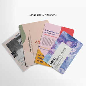 De manière générale, le choix de la forme (standard, carrée ou slim) est une question de préférence. Vous pouvez, par exemple, choisir une forme de carte qui correspond à la personnalité de votre entreprise. Le format standard traditionnel (85 x 55 mm) est le plus courant ; il constitue un bon choix si vous recherchez un effet intemporel et classique. Le format carré (65 x 65 mm) est marqué par l’audace et l’originalité. Il est particulièrement populaire parmi les créatifs du fait de son style novateur et branché. Les cartes de visite slim (85 x 40 mm) sont plus épurées : un juste milieu entre les styles classique et contemporain. Elles offrent un attrait visuel certain, mais aussi l’avantage de pouvoir être rangées dans un porte-cartes de visite.