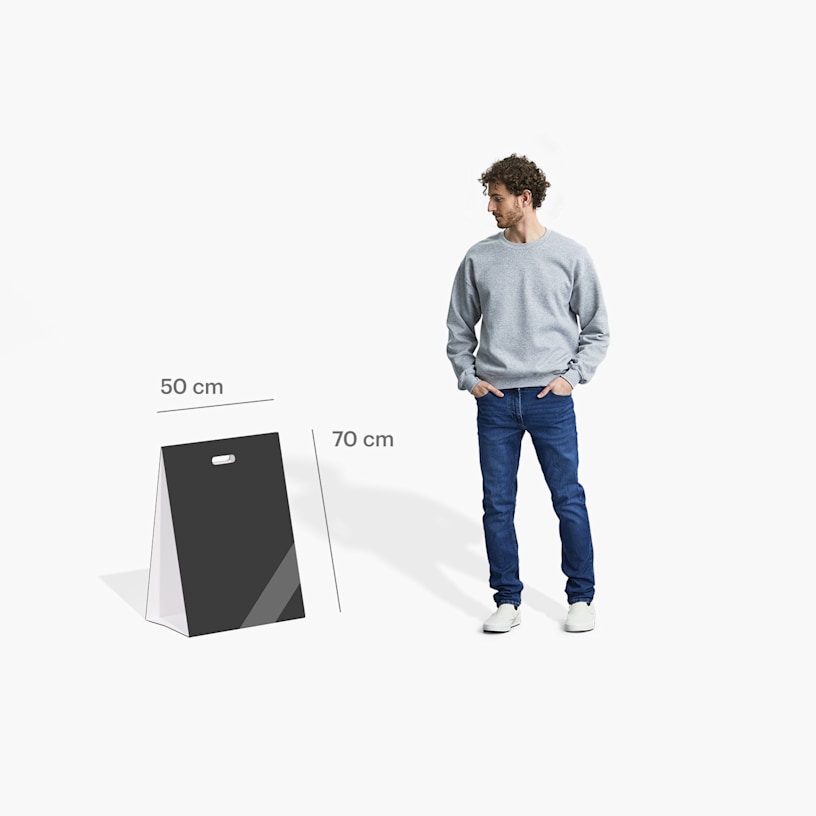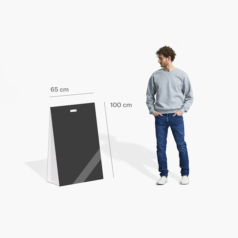 Nos chevalets de sol portables sont composés de 5 mm de plastique ondulé, un panneau en polypropylène léger et abordable, doté d'une structure en nid d'abeille. Aussi bien à la pluie qu'au soleil, ils pourront être utilisés en intérieur comme en extérieur. Nous proposons deux formats : 65 x 100 cm et 50 x 70 cm. Avec leur silhouette souple, l'impression des deux côtés et leurs poignées pratiques, ces chevalets sont des partenaires d'exception pour augmenter votre visibilité et susciter l'intérêt de vos clients et prospects.Un design à votre image en toute simplicité