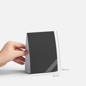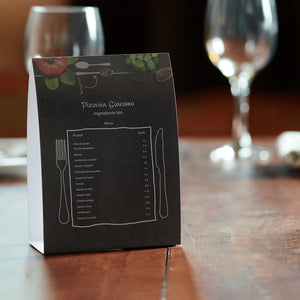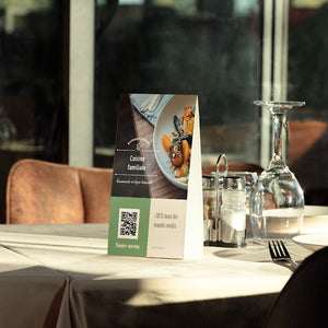 Avec nos chevalets de table personnalisés, n'importe quelle table ou comptoir vous permettra de faire votre promotion. offrant un rendu impeccable, ils mettent en valeur votre image de marque de façon cohérente et professionnelle. Sublimez votre graphisme grâce à 3 types de papiers, dont une option laminée Soft touch de haute qualité. Vous avez également le choix entre 2 formats, pour afficher exactement la quantité d'informations dont vous avez besoin. Si vous cherchez un style sobre sans vouloir renoncer aux détails, utilisez notre pour donner directement accès à votre menu ou à votre site web.Un processus de création en toute simplicité