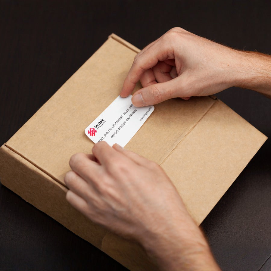 Disponibles dans 2 formats, ces étiquettes d'expédition sont dotées d'un verso adhésif résistant. Ainsi, vous êtes sûr qu'elles ne bougeront pas pendant le transport. Vous hésitez ? Commandez une feuille d'échantillon (4 grandes étiquettes ou 10 petites) pour vous faire une idée du rendu avant de commander des quantités plus importantes.Un processus de création simple
