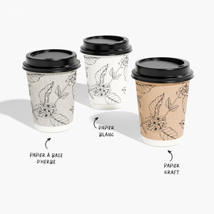 Conjuguant un papier résistant et un revêtement à base d'eau, ces gobelets compostables et recyclables ne font pas de sacrifice sur la qualité. Nous proposons trois formats différents pour répondre aux besoins de votre entreprise et laisser le choix aux clients. N'hésitez pas à commander également des couvercles noirs ou blancs selon vos besoins.Une personnalisation à 360° ultra-facile