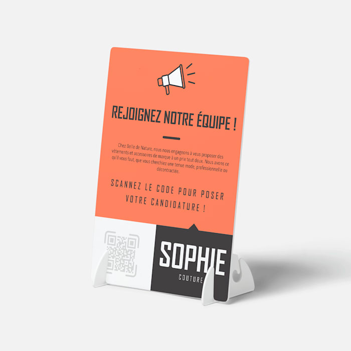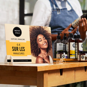 Légers et solides, nos présentoirs de table se transportent facilement et se réutilisent à chaque occasion. Ils s'utilisent également à des fins d'affichage permanent, sur le comptoir d'une boutique ou sur un stand lors d'un évènement. Faites votre choix parmi les deux formats et les deux orientations disponibles et créez le graphisme idéal pour votre espace.Personnalisés en un clin d'œil