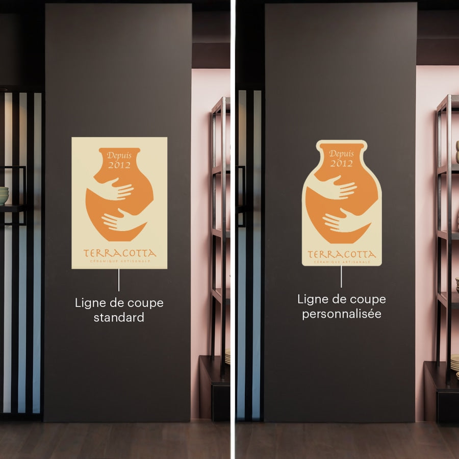 Quel que soit leur usage, vos autocollants muraux personnalisés ne passeront pas inaperçus. Grâce à l'impression en couleur sur un plastique sans PVC blanc ou transparent souple, votre affichage personnalisé sera à la fois éclatant et professionnel. Résistants à l'eau et aux rayures, nos autocollants muraux existent en six formats pour afficher les informations de votre choix : message de bienvenue, horaires d'ouverture, description de vos services... Ils sont conçus pour durer longtemps, qu'ils soient utilisés en intérieur ou en extérieur.Un processus de conception intuitif